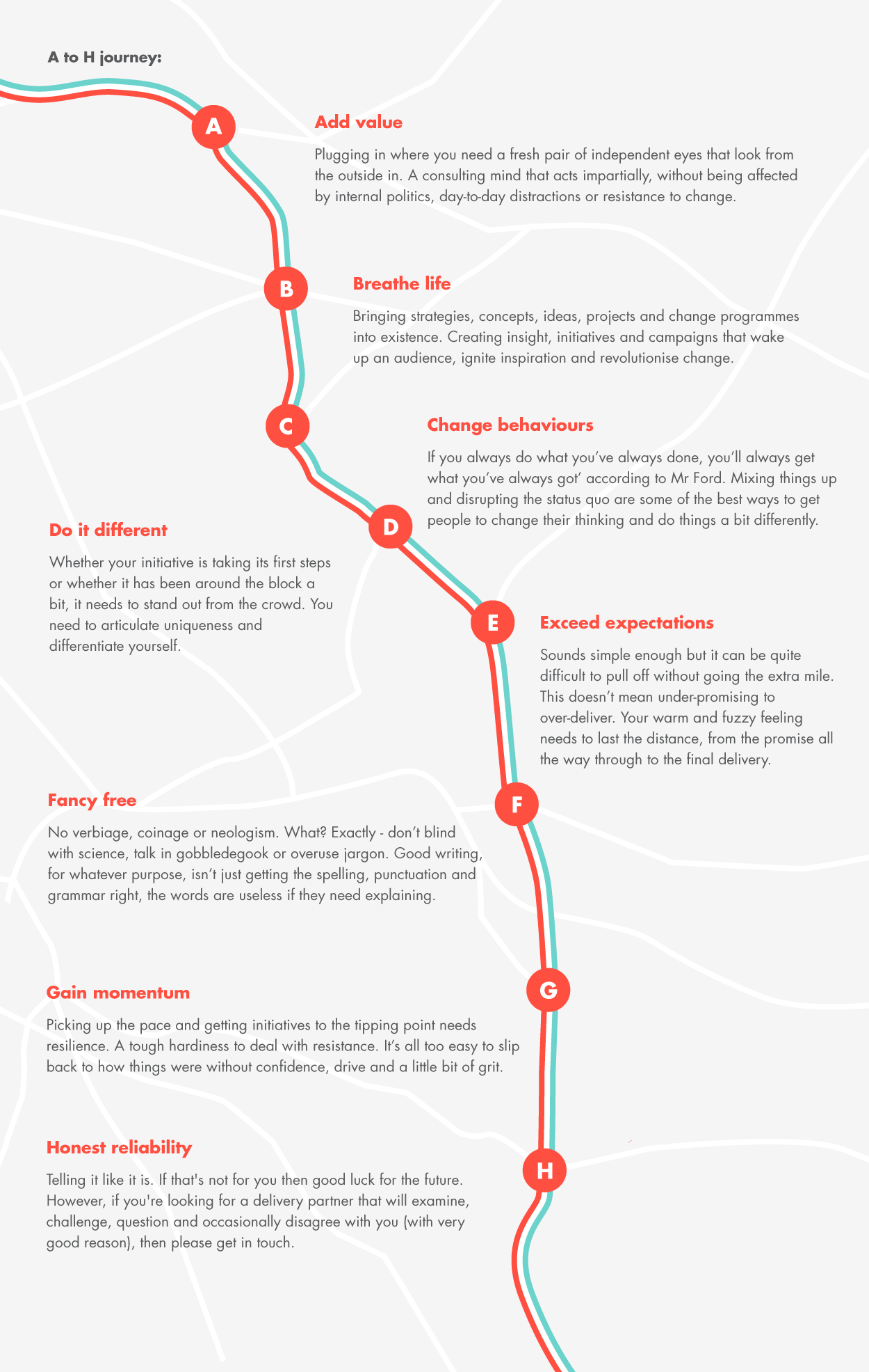 Bringing strategies, concepts, ideas, projects and change programmes into existence. Creating insight, initiatives and campaigns that wake up an audience, ignite inspiration and revolutionise change.